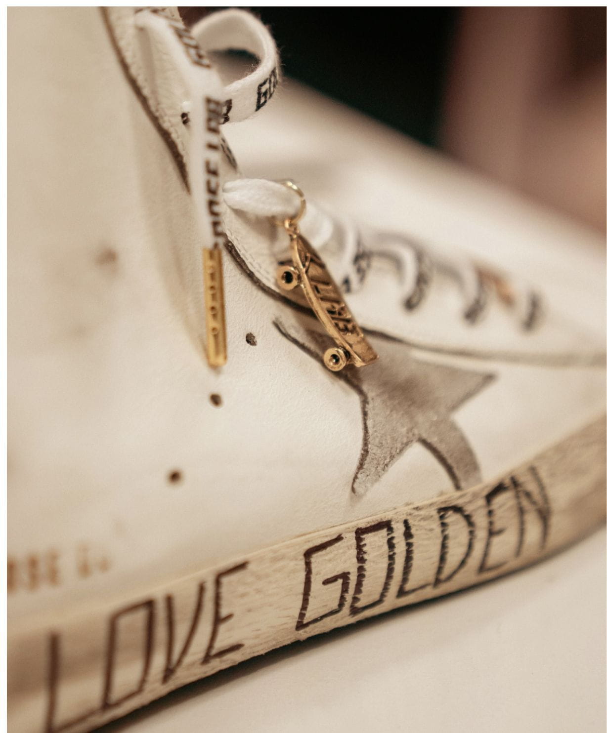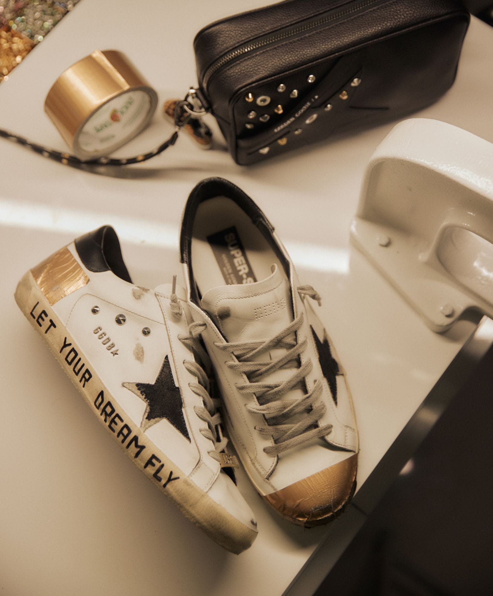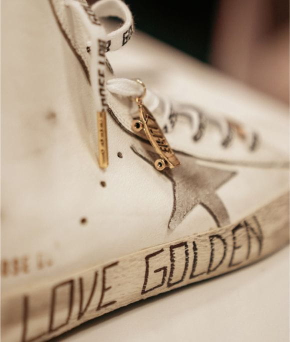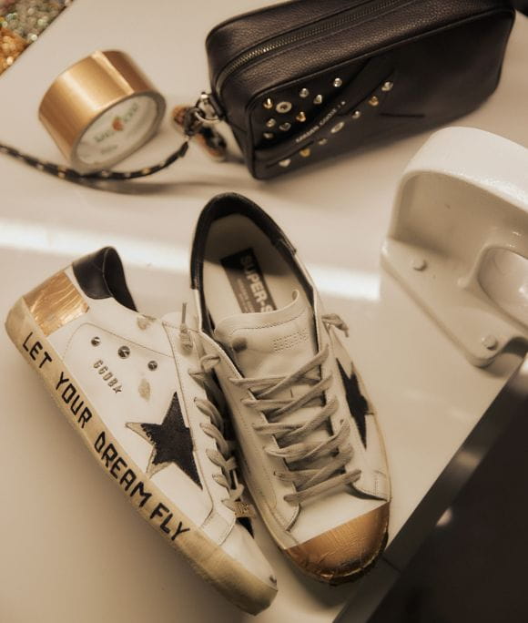 White upper Super Star embellished with golden tape and silver pointed studs presenting a distressed effect on the upper, toe, and star. To complete, extra-dark wax treated laces.