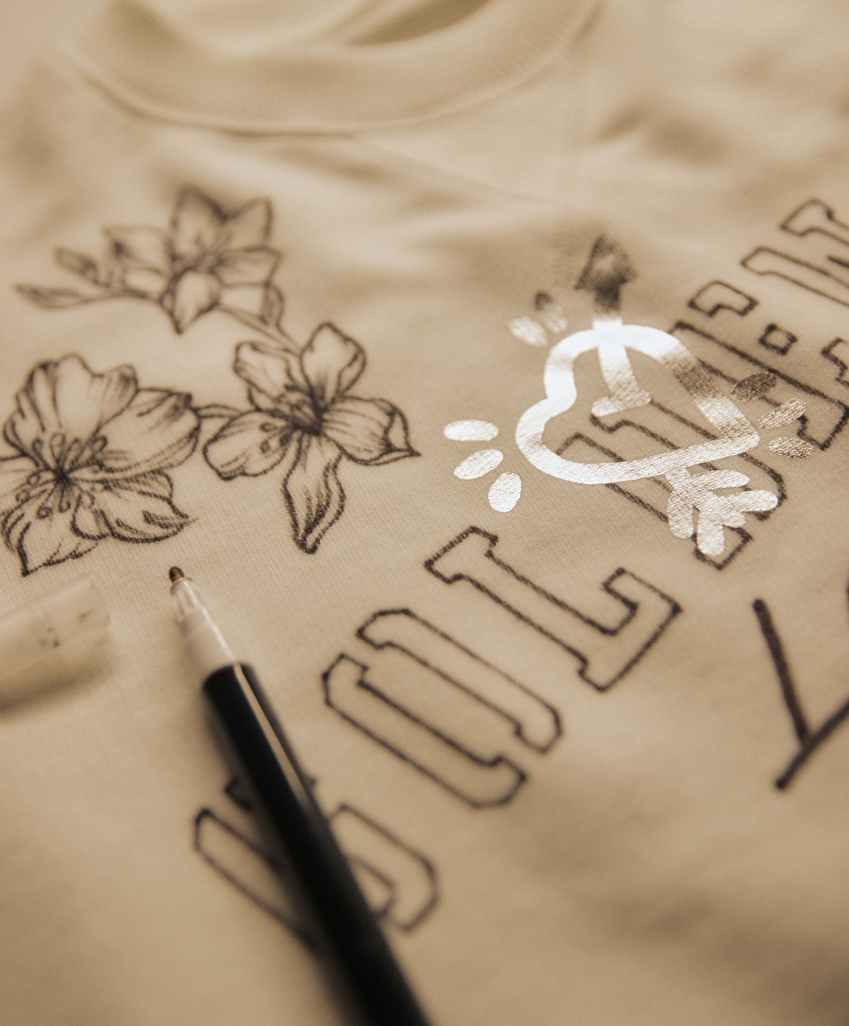 This t-shirt is embellished with freehand floral motif design, golden stencil writing, and a silver heart-shaped transfer.