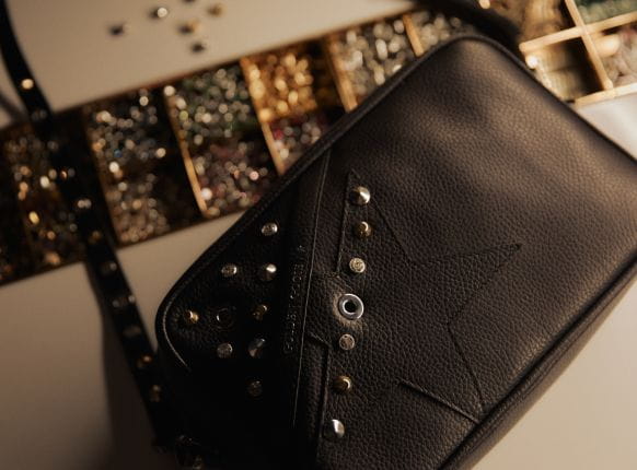 This Star Bag is embellished with a game of silver pointed studs both on the front and on the shoulder strap. The keychain shoe is enriched with gold tape to add a little extra sparkle.